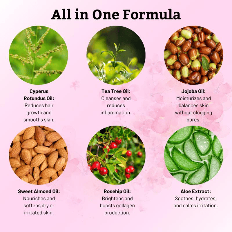 Harness the power of Cyperus Rotundus Oil, the main ingredient known for its natural ability to slow hair regrowth. This potent oil, combined with jojoba oil, rosehip oil, sweet almond oil, and tea tree oil, helping you achieve smoother skin with fewer irritations.