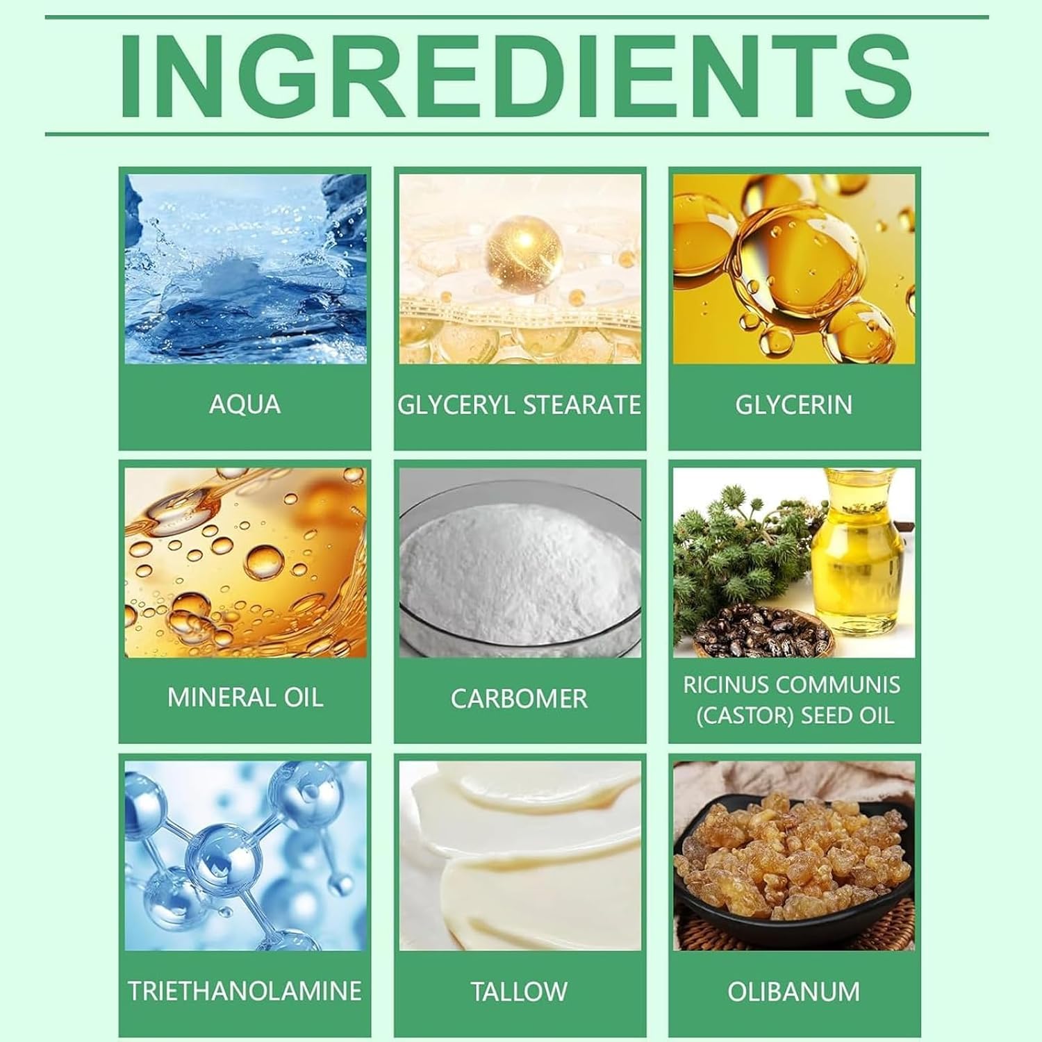 Ingredients: Water, Glycerin, Mineral Oil, Glyceryl Stearate, Carbomer, Triethanolamine, Tallow, Castor Oil, Frankincense.